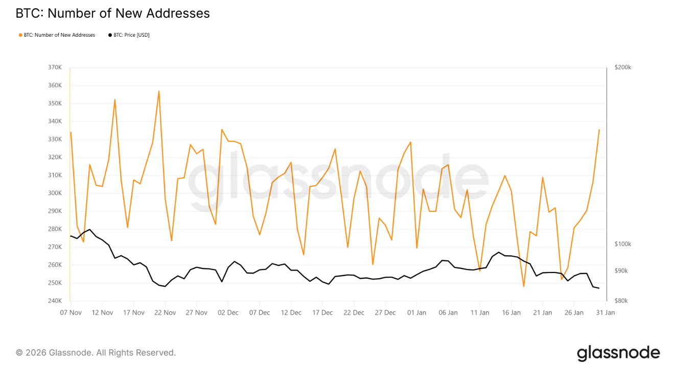 Confirmant ce regain d'intérêt, les données on-chain révèlent une activité frénétique sur le réseau. Au cours des dernières 24 heures, le réseau Bitcoin a enregistré la création de quelque 335 772 nouvelles adresses, ce qui constitue un record en deux mois. Il s'agit de la plus forte augmentation quotidienne depuis novembre 2025.
