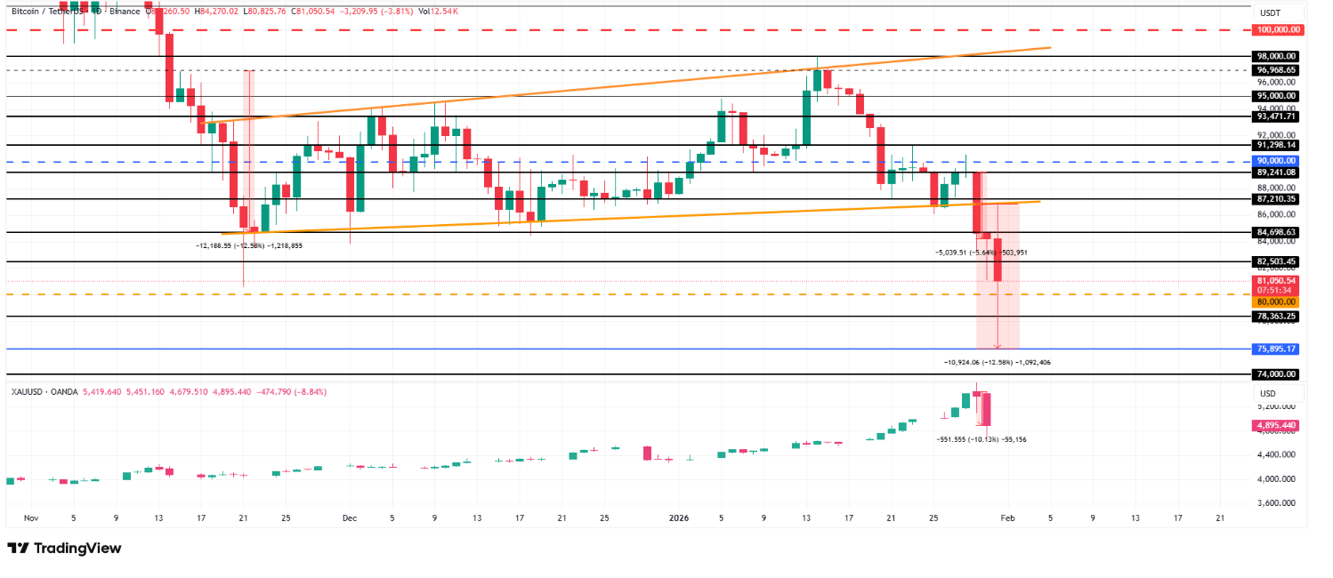 Le contraste entre l'actif numérique et l'actif traditionnel est apparu clairement à la fin de la semaine dernière. Entre jeudi et vendredi, l'or a subi une violente liquidation, chutant de près de 10 %. Dans le même laps de temps, le bitcoin a connu une baisse beaucoup plus modérée d'environ 5,6 %.