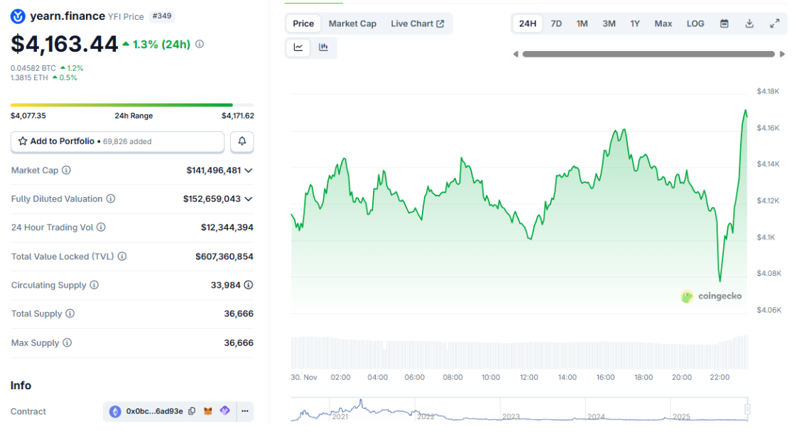 La réaction du marché a créé une anomalie inattendue. Immédiatement après que l'exploit a été signalé sur les médias sociaux, le prix du jeton de gouvernance de Yearn, YFI, a fortement augmenté, passant d'environ 4 080 dollars à plus de 4 160 dollars en moins d'une heure.